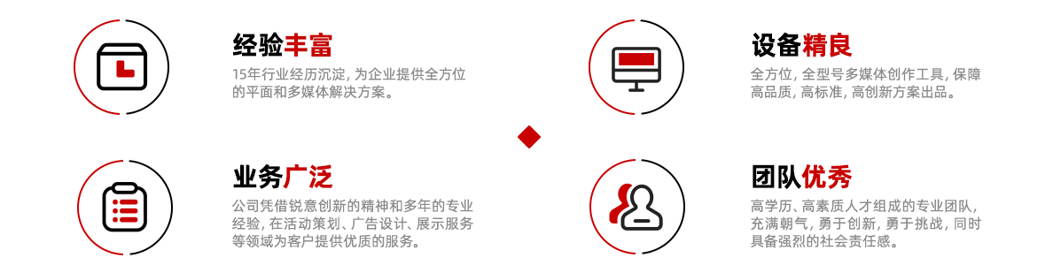 憑借銳意創(chuàng)新的精神和多年的專業(yè)經(jīng)驗(yàn),在活動(dòng)策劃、廣告設(shè)計(jì)、展示服務(wù)等領(lǐng)域?yàn)榭蛻籼峁﹥?yōu)質(zhì)的服務(wù)。